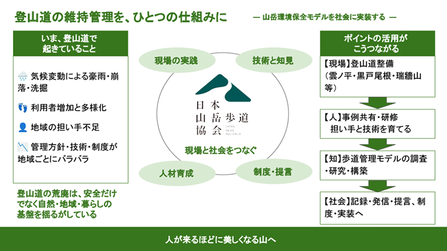 日本山岳歩道協会は、山岳環境保全モデルを社会に実装することを目指し、