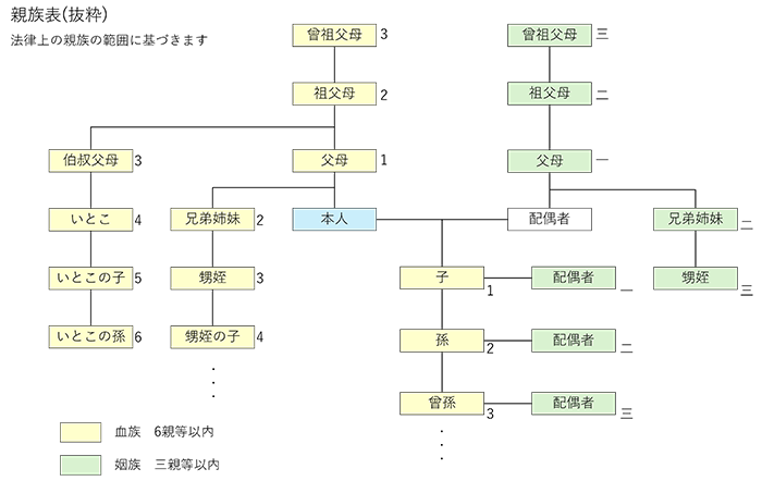 親族とは、6親等内の血族、配偶者および3親等内の姻族となります。